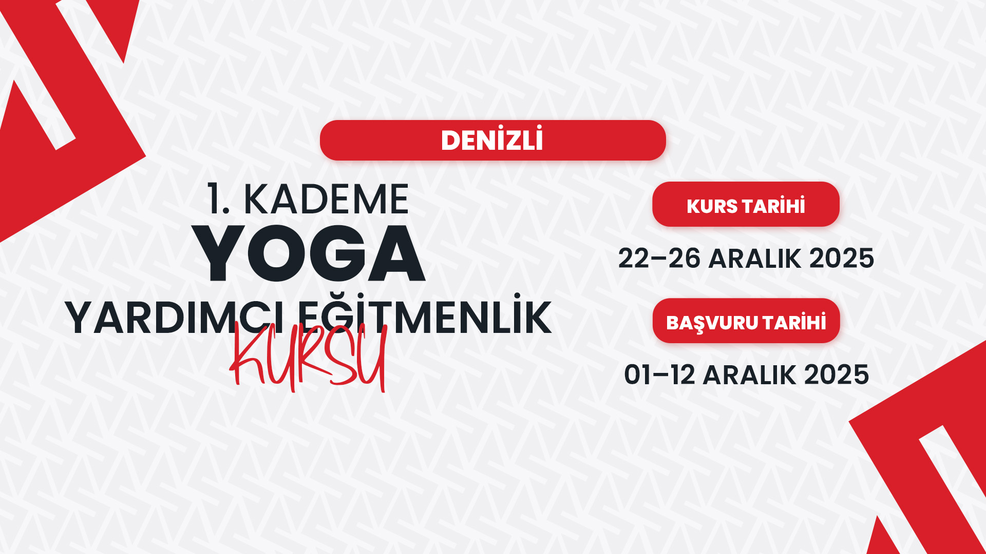 Denizli'de 22–26 Aralık 2025 tarihleri arasında (YÜZ YÜZE) Yoga 1. Kademe Yardımcı Eğitmenlik Kursu düzenlenecektir. Detaylı bilgi için tıklayınız.